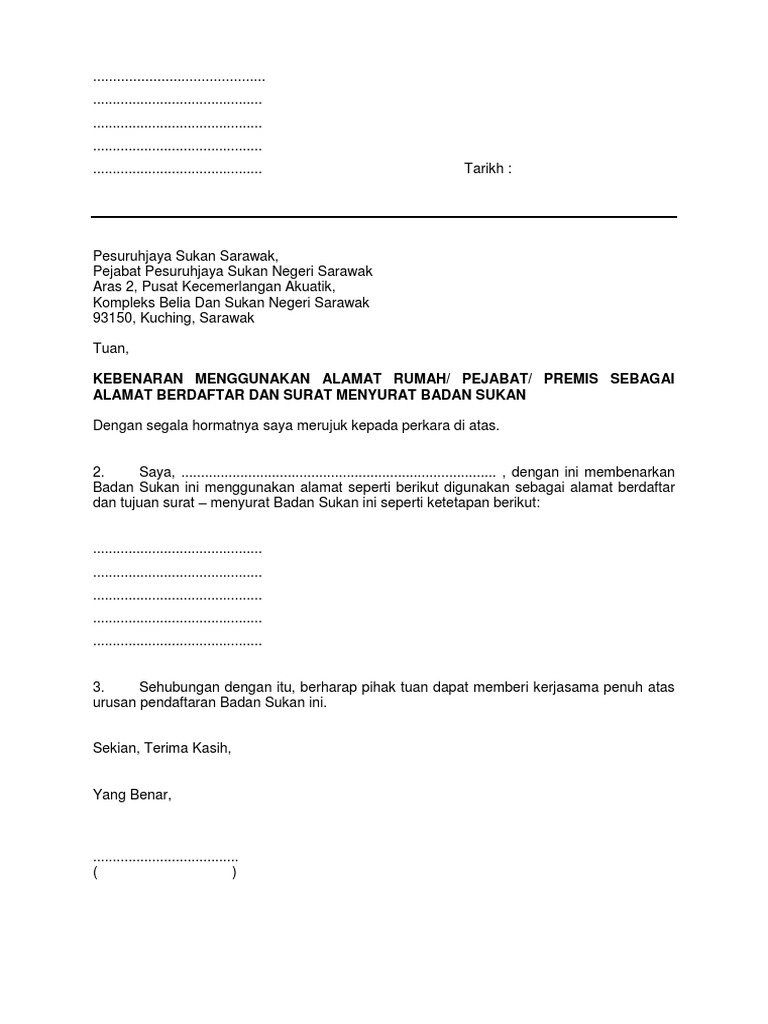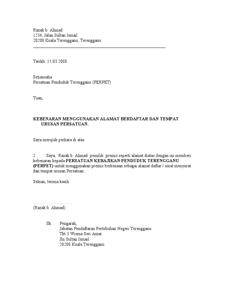 Contoh Surat Kebenaran Menggunakan Alamat Kediaman Sebagai Alamat Berdaftar Kelab Pdf